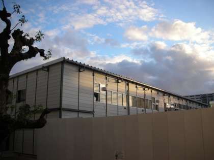 下の写真は、北東方向を撮影したものです。仮設校舎にあたっている日差しもまだ弱いですね。空には雲がたくさん見えています。