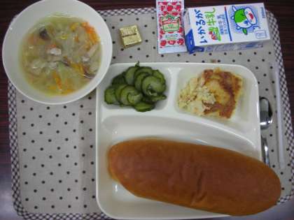 本日の給食は、ツナポテトオムレツ、スープ、きゅうりのバジル風味サラダ、パン、牛乳、マーガリン、ケチャップでした。
