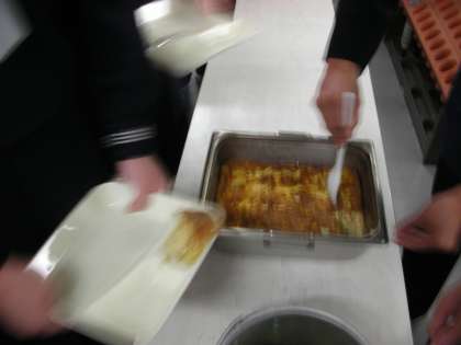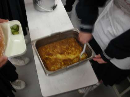各クラスの当番の人は、ツナポテトオムレツを手際よく取り分けています。