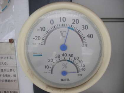 仮設校舎前のいつもの温度計は18.2度、湿度96パーセントです。