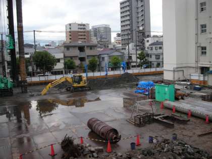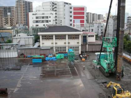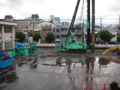 工事現場を見ると、杭打機の場所が移動しています。着実のその場所を変えながら、作業をしています。また、西側にプール状になっていた土は、場所を変え、新たにプール状の盛り土部分ができています。