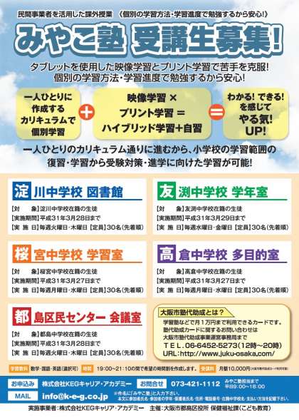 都島区役所からの連絡です。民間事業者を活用した課外授業受講生の募集です。