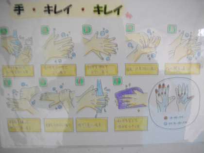 下の写真は、水道のあるところに掲示された手書きのポスターです。手をきれいに洗う方法がわかりやすく図示されています。