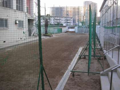 体育館と仮設校舎の間の“グラウンド”です。昨日は、雨の影響で所々に水たまりができていました。昨日は、部活動で使用した後できれいに整地されたようです。きれいになっていますね。素晴らしいことですね。