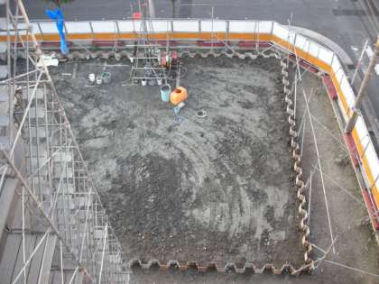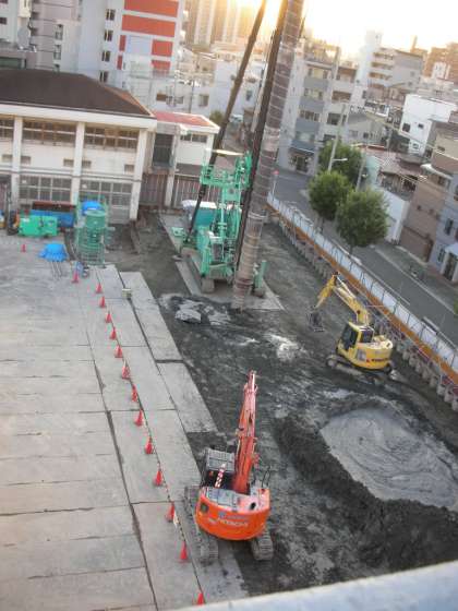 上は、都中の南西角の部分です。エレベーターホールの部分には、足場が組まれています。地面には、やぐらのようなものが立てられています。