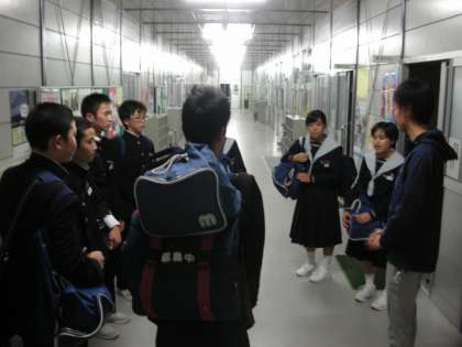 仮設校舎1階の廊下で、剣道部の皆さんが、顧問の古川先生と練習後のミーティングをしています。
