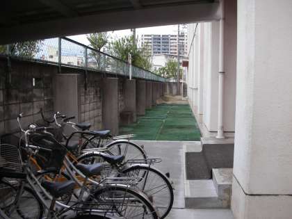 この写真は、体育館裏(北側)のものです。自転車置き場の向こう側はずっと見えています。グリーンのシートがひかれています。そのはかは何も見えません。