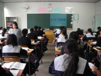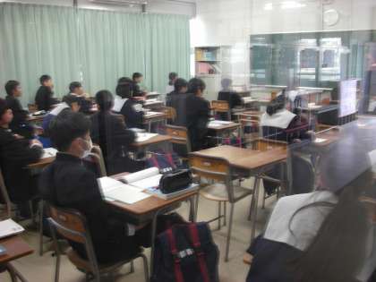 真ん中は、3組の英語の授業です。白板に映し出された画面を見ながら、発音練習をしています。