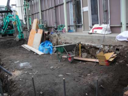 新南館の南東部分(技術室の北側)に、給食運搬用の通路ができます。この通路の工事が始まりました。
