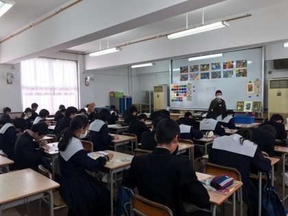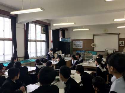 上は、1年1組の理科の授業です。理科室で、ガスバーナーの使い方について学んでいます。