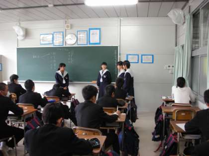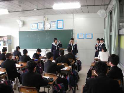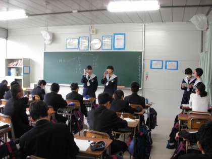 友達に電話をかけて、出かける約束をするというものです。班ごとに前に出て、それぞれの役割を演じるというものです。せりふを英語で暗唱し、仕草を交えながら演じるというものです。