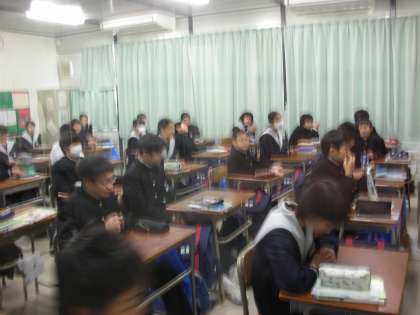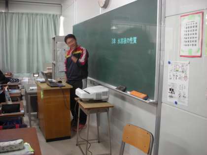 1年2組では、康永先生がパソコンとプロジェクターを使って、黒板に文字を映しています。生徒たちは何がは決まるのか、興味津々です。
