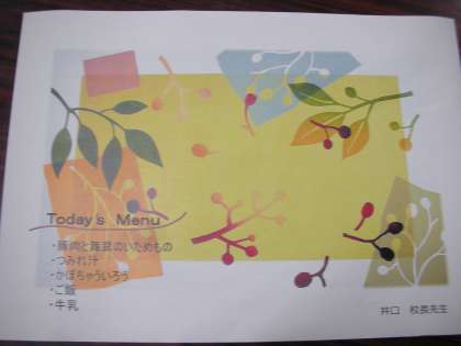 学級委員さんの手作りのランチョンマットを敷いて、その上に給食の食器を置いて、いただきました。