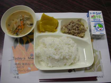 この日のメニューは、豚肉とまいたけのいためもの、つみれ汁、カボチャういろう、米飯、牛乳でした。