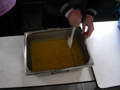 カボチャういろうは、1枚の長方形の形で調理されています。食器に取り分けるときには、当番の人が目分量でカットしていきます。不公平感がでないように丁寧にカットしています。