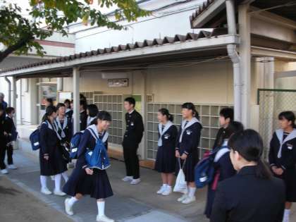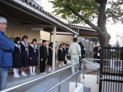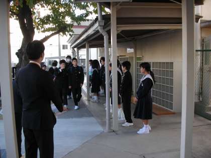 正門で登校してくる生徒を迎えています。