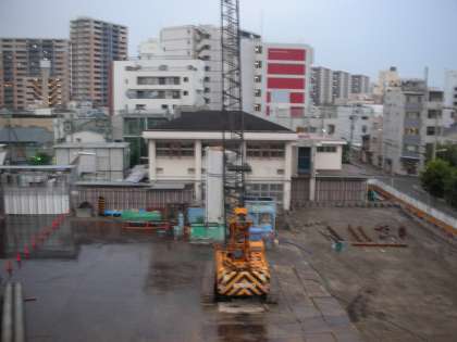 西館4階から、東の方向を撮影したものです。雨のため工事現場に敷かれた鉄板が濡れています。