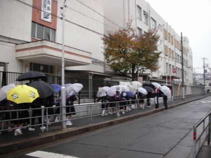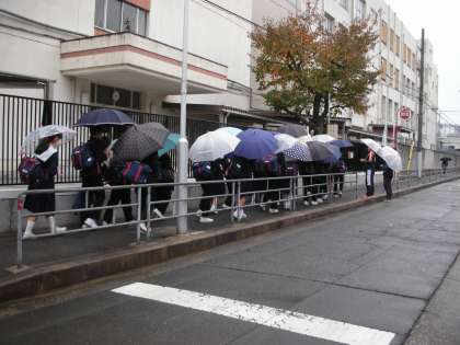 傘をさしての登校ということで、時々、生徒の列が渋滞してしまうことがあります。