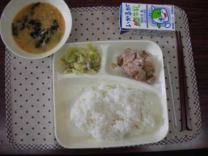 本日の給食は、鶏肉のしょうゆマヨネーズ焼き、なめこの味噌汁、キャベツの炒めもの、米飯、牛乳です。