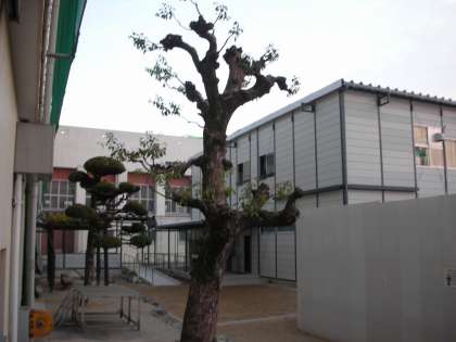 上の写真は、理科室前から仮設校舎、体育館方向を撮影したものです。2本の樹木の緑色が大きな存在感を示しています。