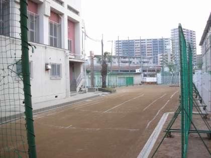 下の写真は、仮設校舎前の廊下から撮影したグラウンドの写真です。きれいに整備された土の表面です。向こう側に環状線が走っています。