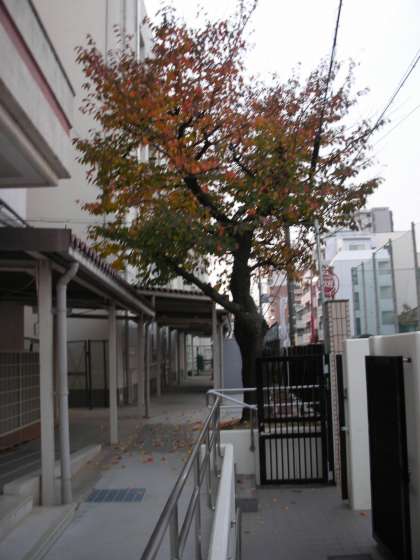 体育館前から撮影した正門付近の写真です。桜の木の葉が色づき、そして毎日落ち葉になって、路面に多彩な模様をつけています。冬の到来を感じさせてくれる風景ですね。
