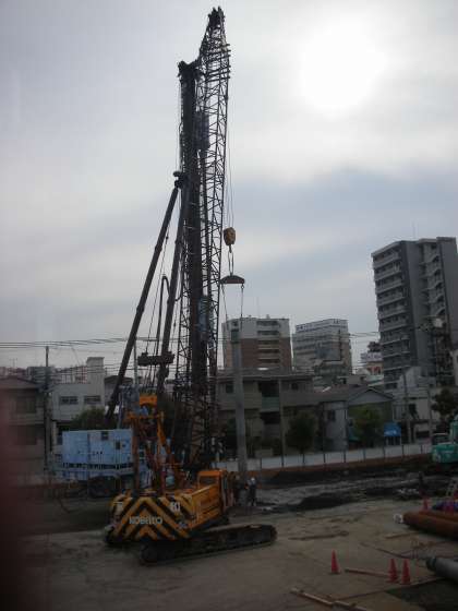 大きなクレーン車が杭を持ち上げています。そのまま掘られた穴に挿入されていきます。ダイナミックな作業です。