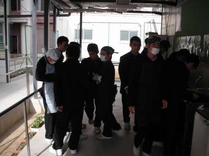 昨日の給食の様子です。水道の周りには、多くの生徒が集まります。