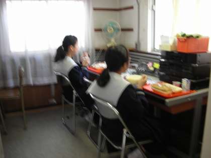 放送室の様子です。 この日の係の人たちが、Jポップを流しています。食事をしながらの活動です。