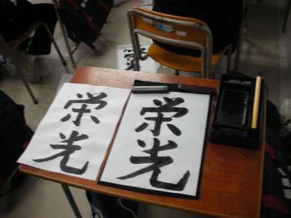 時間に限りがあるので、墨汁を使います。『栄光』という文字を書いています。