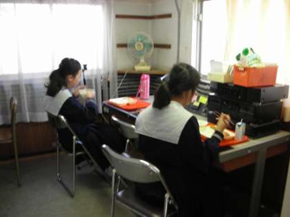 放送部の活動の様子です。 食事をとりながら、お昼の放送を流しています。 今日は、『アニソン』の日です。