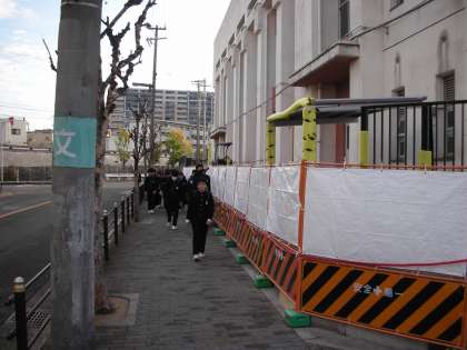 北側の歩道には、ブロック塀工事のためにフェンスが設置されています。