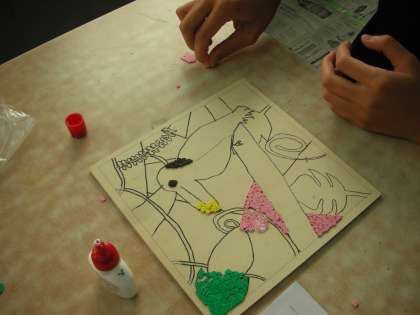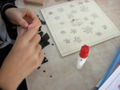 モザイクチップを細かくして、下絵の上に貼り付けていきます。色のついたモザイクチップが貼り付けられると、とても立体的になってきます。