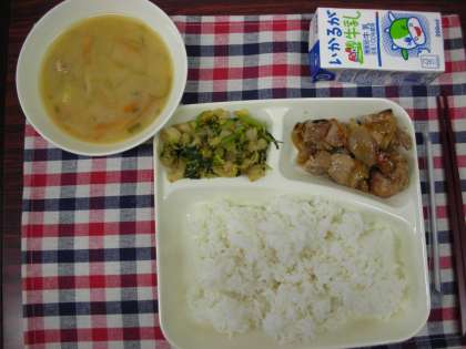 本日は、鶏肉の甘辛焼き、味噌汁、きくなと白菜のごまあえ、米飯、牛乳でした。