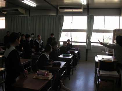 2年2組の教室の前を通ると、「ピンポン」という音が聞こえてきました。「何だろうか」と、のぞいてみると、クイズ形式で生徒が先生の質問に英語で答えているのです。正解すれば「ピンポン」、不正解なら「ブー」と音が鳴ります。