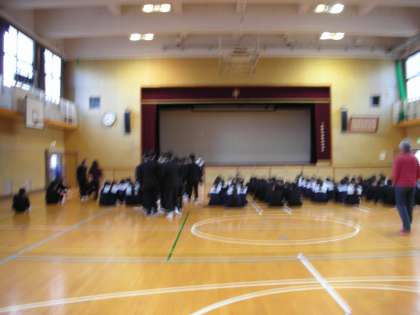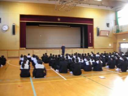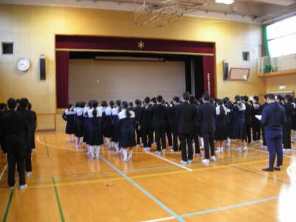 学級代表が号令をかけます。生徒が主体的に動くことができるように、集会の中で訓練しています。