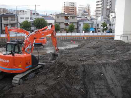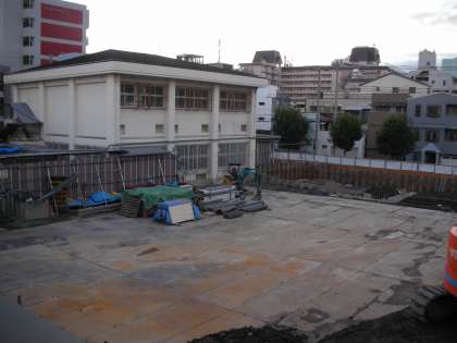 南館の基礎部分の土が仮設校舎側に保管されています。基礎の部分は、地中になるので、一旦土を掘りだし、作業を行っているのです。この土は、再び埋め戻されます。