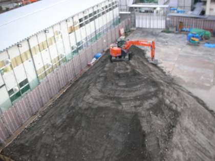 真ん中は、仮設校舎方向を撮影したものです。南館建設場所の土を掘りだし、その土が崩れないように山のように押し固められています。この土はまた元の場所に埋め戻されます。