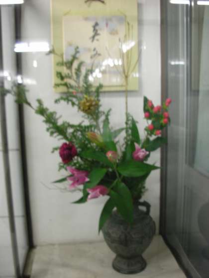 仮設校舎1階の生け花が新しくなりました。昨日の夕刻に近隣の方が、生けに来てくださいました。