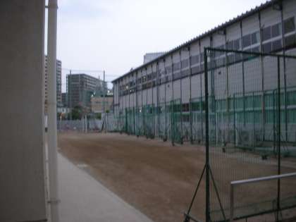 体育館前から撮影した南東方向の写真です。左が体育館、中央が仮設校舎です。