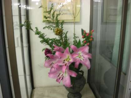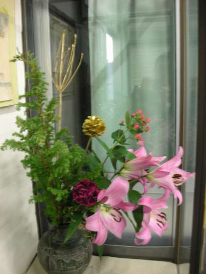 お正月の飾りも添えられています。季節感あふれる生け花ですね。