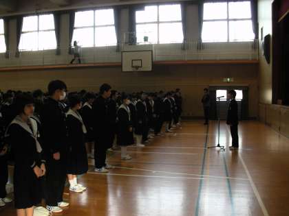 9時ちょうどに、生徒会会長の号令がかかりました。全員があいさつをして、人員点呼、担任の先生に報告、その後終業式が始まりました。