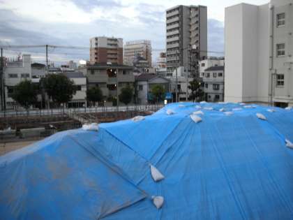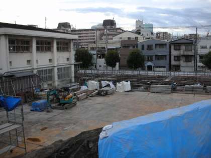 南館が建つ場所を掘った土が高く積まれています。崩れないように押し固めて、その上からシートがかぶされています。工事は、年内は明日までです。どうぞ、よろしくお願いします。