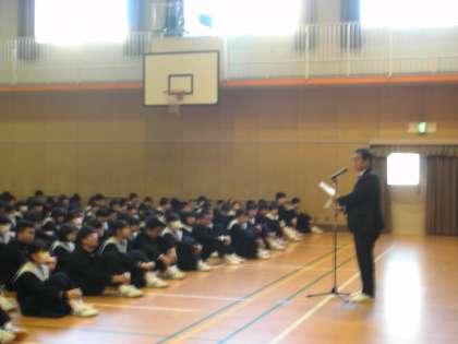 また、生徒会の目標である『あいさつと掃除』を休み中に実践できたかどうか、問いました。年末は大清掃をするお家が多く、そのお手伝いができたかどうか、年始には「あけましておめでとうございます」というあいさつができたかどうか、生徒一人ひとりに問いかけました。