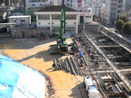 西館4階から撮影しました。 大きなクレーンが資材を移動しています。順調に進んでいます。