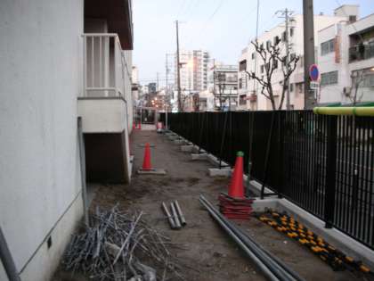 右側の写真は、北側に残っているブロック塀の工事の様子です。すでにクラブ倉庫の裏側まで解体が進んでいます。順次、駒込柵に替えられていきます。
