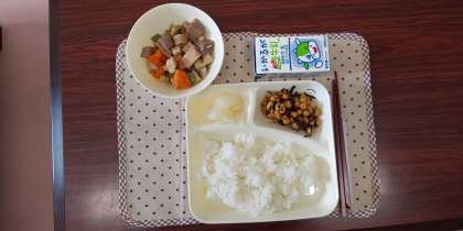 筑前煮、ひじき豆、だいこんの柚子風味、米飯、牛乳です。