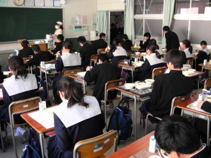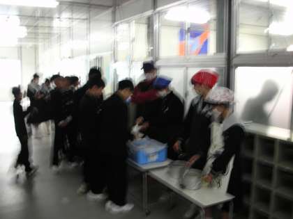 給食を受け取るときには、みんなが並んで順番に受け取ります。