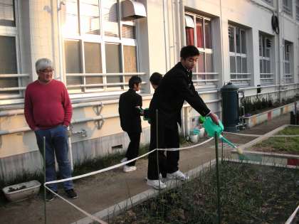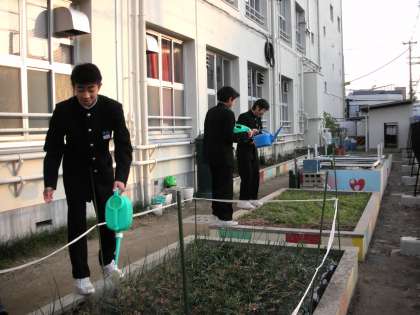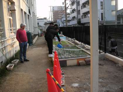 プランターや畑に水をまいています。お花や野菜がほほえんでいるように見えます。