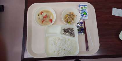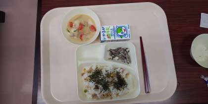 れんこんのちらしずし、雑煮、ごまめ、米飯、牛乳です。刻みのりがついています。